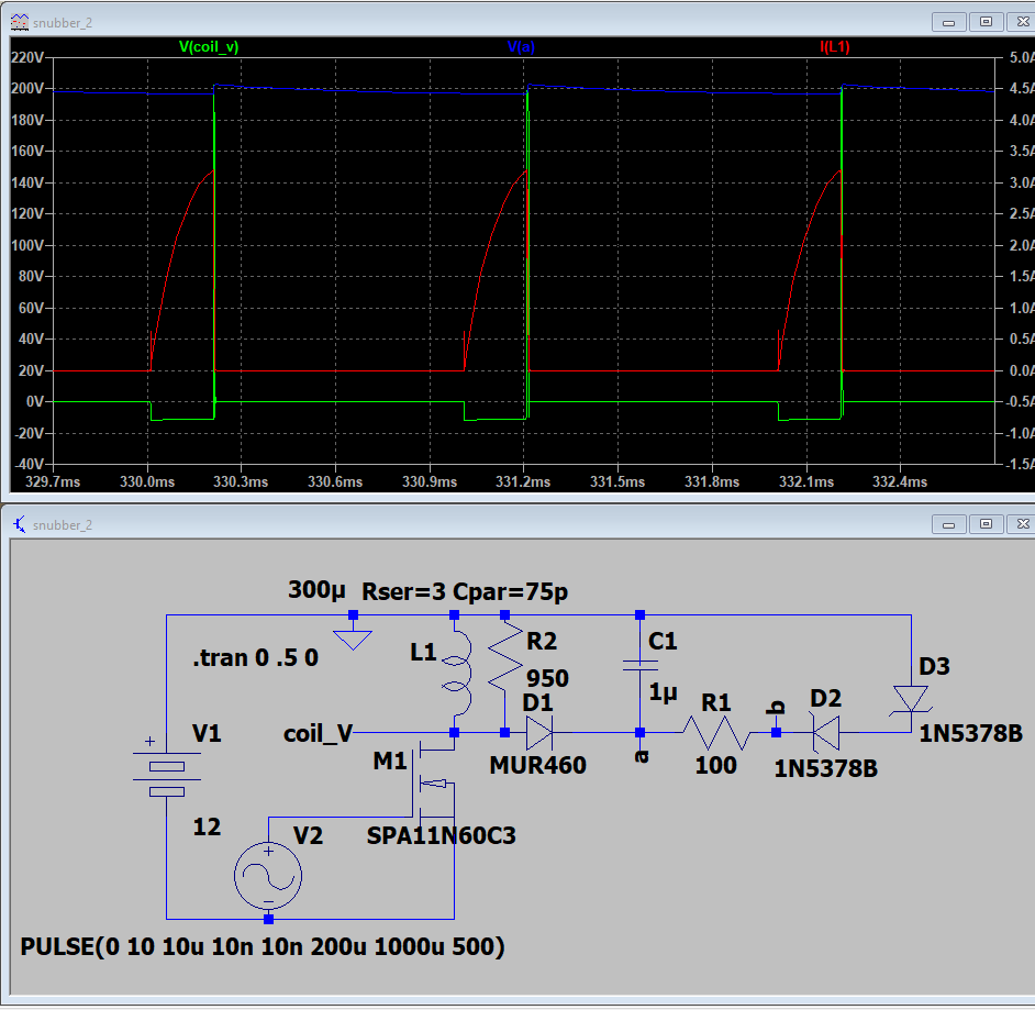 The peak energy in the inductor isOriginally posted by green View PostTried a snubber in spice. The storage capacitor can be alot less than I was thinking. Not sure why yet. Maybe thinking wrong or something wrong with the simulation.