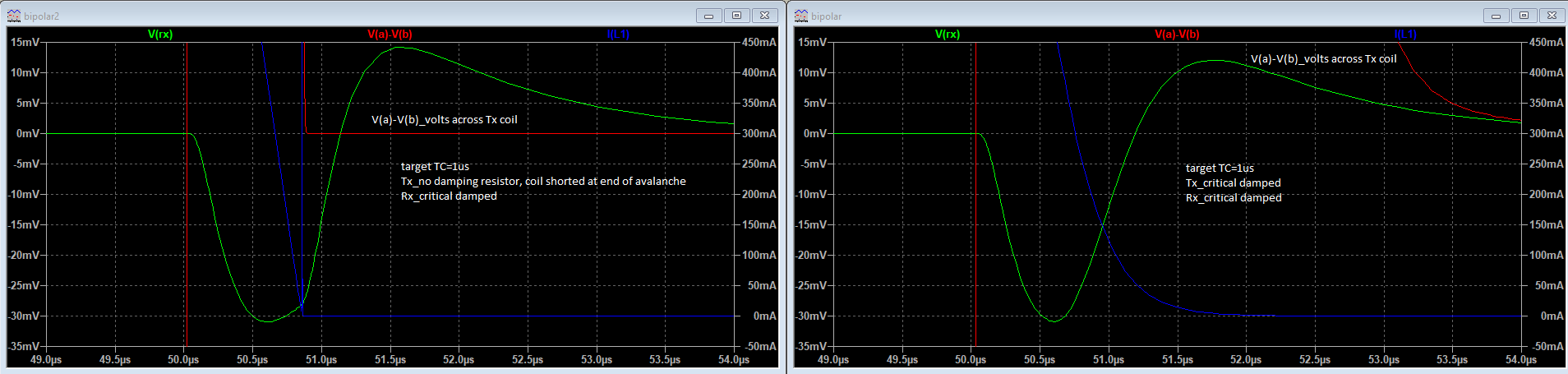 Green,Originally posted by green View PostMade spice simulation bipolar, similar to my unipolar circuit. Need about 3.5us delay with my circuit, spice circuit looks like less than 2us delay would work. Maybe my amplifier or something I'm missing is the problem. Wondering if coil volts not decayed enough could be causing the problem. Coil volts=rate of current change(X signal?). How low should the rate of change of Tx current be when sampling the signal with a PI(separate Tx and Rx)? .015V/300uH=50A/second, could that be a problem? Looks like trying the circuit not critical damped would be worth trying?