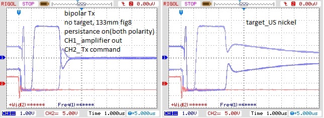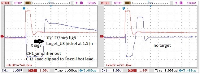 Wondering about the X signal(coil current not decayed enough)I did a test this morning with the 133mm fig8 coil unipolar circuit. Adjusted damping for best amplifier out signal. X and R signal are opposite phase for non ferrous targets(nickel). Amplifier signal goes more negative until R signal overrides X signal at about 2.5us after Tx off. Maybe the reason can't sample closer to spice simulation time around 2us delay? Make sense or am I still missing something?Originally posted by green View PostMade spice simulation bipolar, similar to my unipolar circuit. Need about 3.5us delay with my circuit, spice circuit looks like less than 2us delay would work. Maybe my amplifier or something I'm missing is the problem. Wondering if coil volts not decayed enough could be causing the problem. Coil volts=rate of current change(X signal?). How low should the rate of change of Tx current be when sampling the signal with a PI(separate Tx and Rx)? .015V/300uH=50A/second, could that be a problem? Looks like trying the circuit not critical damped would be worth trying?