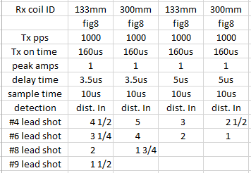 A test comparing 133mm and 300mm I.D. coils at 3.5 and 5us delays with #9, #8, #6 and #4 lead shot. Tested lead shot is good for comparing distance for nuggets less than about 2 grains. Adjusted target distance for about 1.5mV change at integrator out.Attached Files