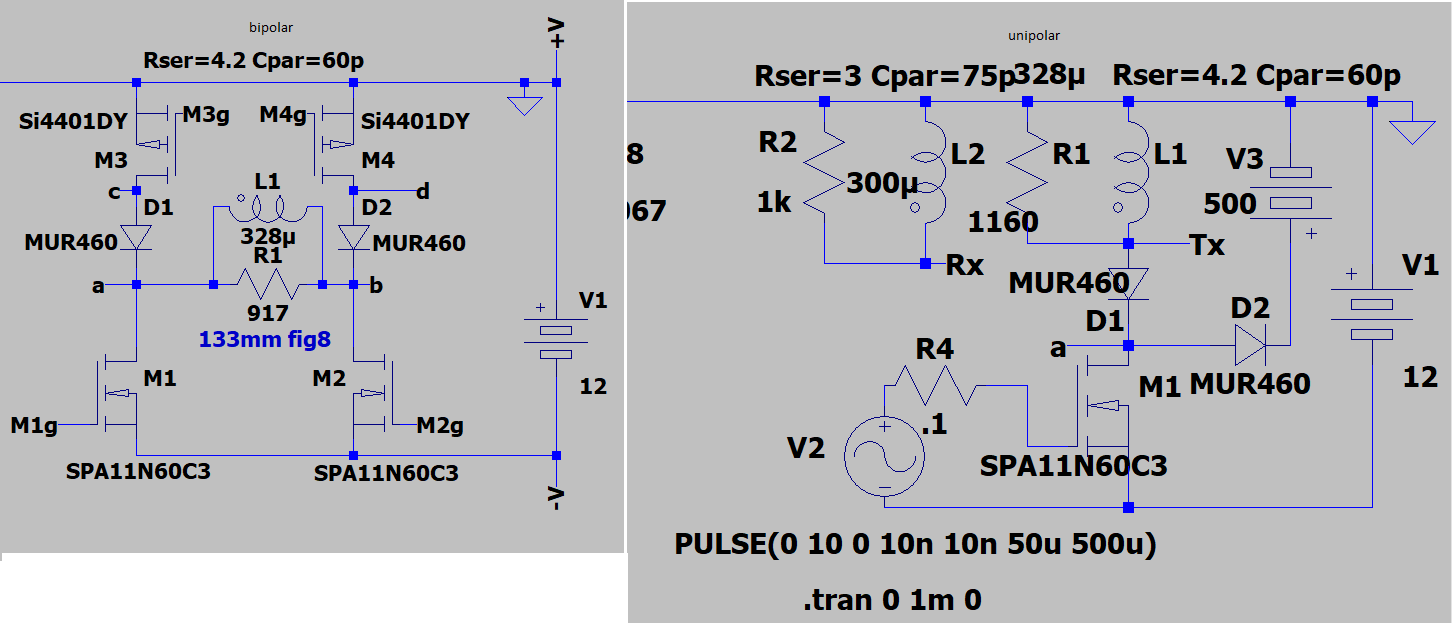 Made a bipolar Tx circuit similar to picture(Tx eight). Different MOSFETS, used what I had. Bipolar doesn't look bad, unipolar circuit needs less damping(spice circuit also). Including spice simulations I've been paying with. Has anyone tried dumping the coil current to zero similar to bipolar2 simulation. Looks faster than critical damped but requires turn off time to repeat to 1 or 2 nano seconds(spice simulation). Anyone have another suggestion for dumping the coil current faster than critical damped.