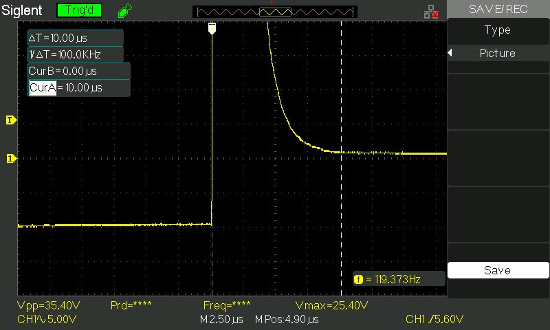 I have use a breadboard to test the driver circuit (timer + power). I used a function generator to created a pulse at 120Hz (1.2% duty) ~100uS (signal positive 10V pulse width)