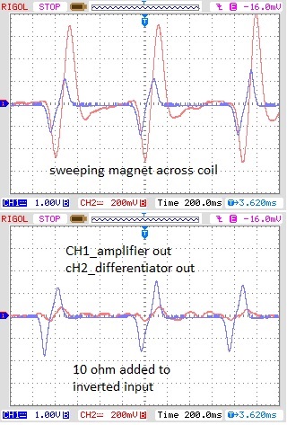 Needed to add a trim pot to integrator in with my unipolar Tx to reduce EF signal. Checked EF signal this morning with bipolar Tx. Was seeing a signal at amplifier out and differentiator out when sweeping a magnet across the coil. After some playing I added a switch so I could disable Tx command to MOSFETS, signal from magnet field only. Added a pot to integrator inverted input, 11 ohms appeared to cancel magnet signal best. Removed pot, connected a 10 ohm resistor to amplifier inverted out and connected integrator invert in to 10 ohm resistor. Recorded sweeping a magnet across coil with 10 ohm and with 10 ohm shorted. A .2% change in integrator Rin is easily visible. With Tx disabled a ceramic or neodymium magnet could be used(don't over range the amplifier). I have read where a fridge magnet could be used. Tried with Tx disabled, no signal. With Tx enabled I get a signal with either of the magnets including the fridge magnet. Maybe because I'm sampling after a 4us delay. Is there a R signal with a ceramic or fridge magnet(can see a X signal at amplifier out and a signal at integrator out when magnet is stationary over the coil),or my circuit not good enough to sample that soon?
