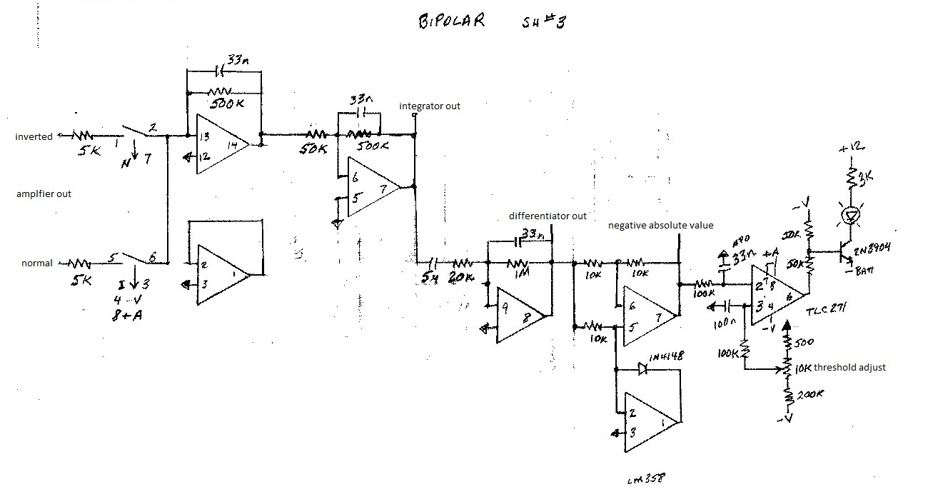 A pot was used to trim the unipolar integrator. Wiper to integrator in(pin 13)pot ends to switch outputs(pins 2 and6).