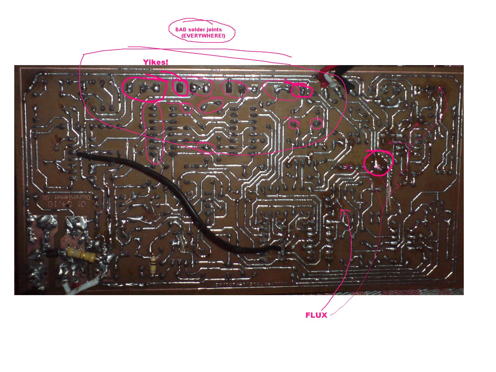 1. Too much solder on the joints. LESS is better. Do not leave globs, or blobs of solder when you make a solder joint. You can have a bad solder joint and just because it has gobs of solder, that does not make it good. Make it look nice. It works better that way.