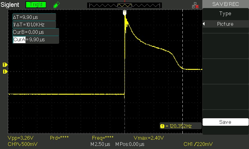I am beginning to make a Deltapulse. I have use a breadboard to test the driver circuit (timer + power). I used a function generator to created a pulse at 120Hz (1.2% duty) and ~100uS (pulse width)