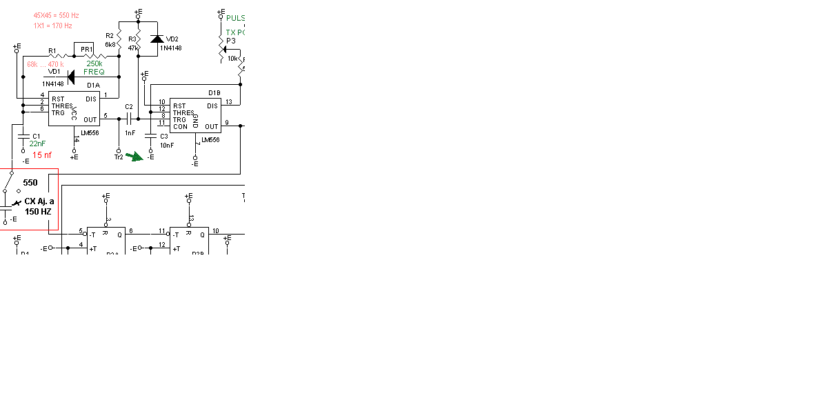 Ne556 was swapped in, but he did not want to vibrate. Capacitors, resistors ok, the diodes as well. The first half of the ic wibrating well, but not the 9-foot. I noticed that the potentiometer (noise) soldered was broken. That was the trouble. :-)