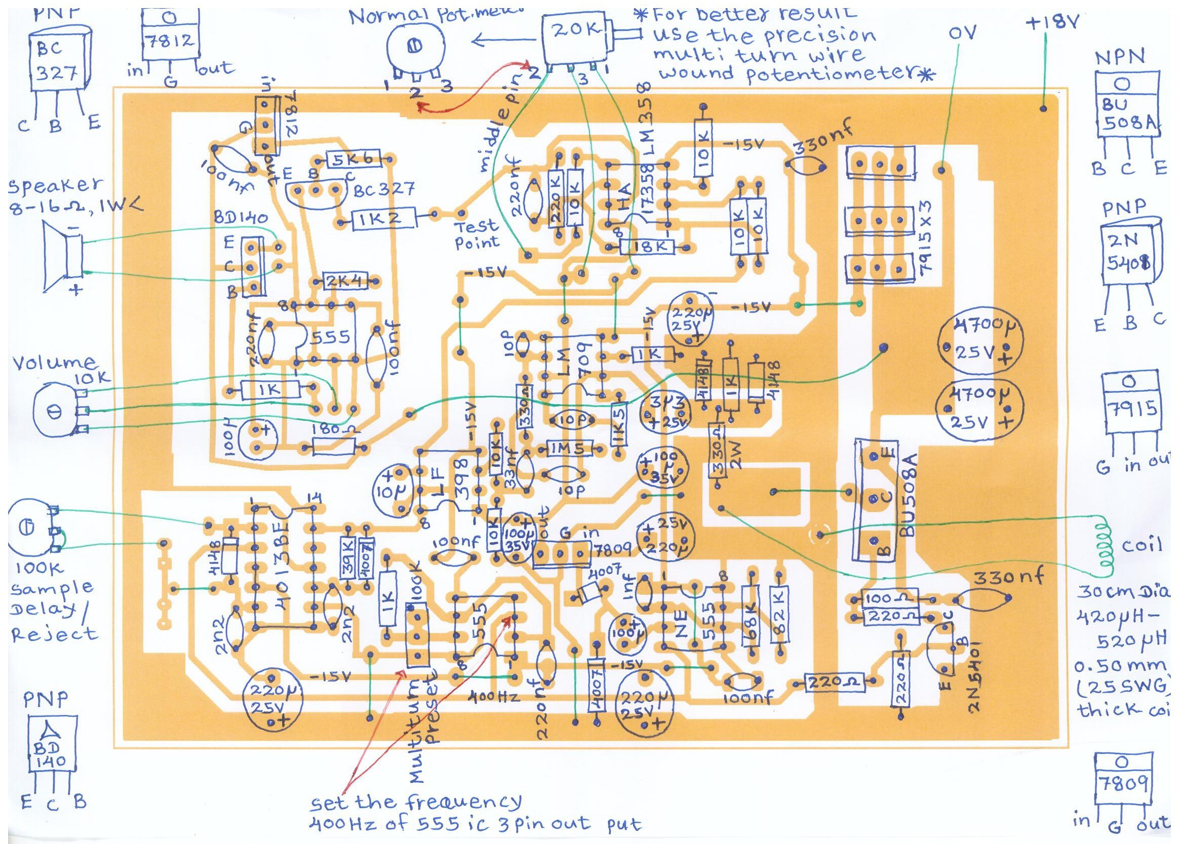 By asking such questions, I understand that you do not even have basic electronic knowledge. The Lm331 is replaced with a better volume, volume controllable VCO circuit. Who told the big lie that the whole circuit heats up when increasing to 400Hz frequency? It is a fault in your circuit.if your BU508A transistor get hot please put the heatzink.Positioning of variable resistor [20K] is correct. It controls the output of the LM 358 [integrator]. Also if your variable resister get hot to connect this way maybe wrong pin soldering. I have not tried coins. Men's wedding rings look 8 inches [ in the discrimination mod ]. I am from sri lanka [ south asia country]