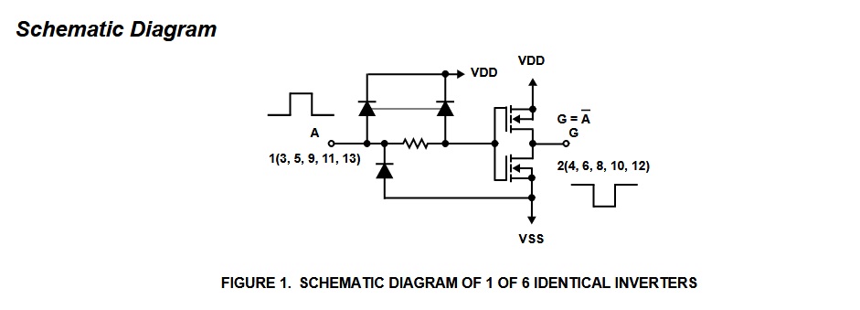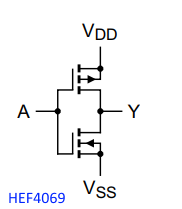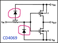 Note: This trick will only work with unbuffered CMOS gates or inverters. That means, for 4000-series chips, the ones with a U suffix, such as 4002UB. For 74 series chips it means ones with a single 'C' in the part number, such as 74C04 (but not 74HC04. It also won't work with Schmitt trigger parts such as 40106UB or 74C14. And it certainly won't work with TTL chips like 74LS04, 7404, 74S04).