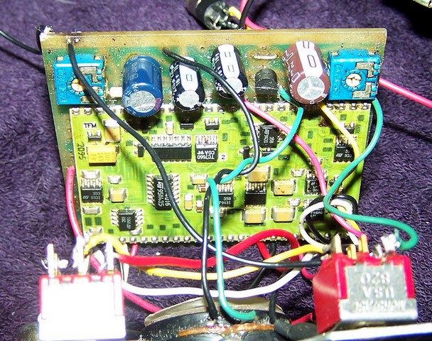 OK, that confirms the black device is a 5V LDO regulator (LM2931A-5.0) which is what I hoped, and the yellow wire you mention is the switched 9V battery positive. So the 9V battery positive should connect to the red wire which is adjacent to the yellow wire on the switched part of the sensitivity control. The switched part should have just two wires (red and yellow). Don't connect the 9V to any of the group of 3 pins on the sensitivity control.