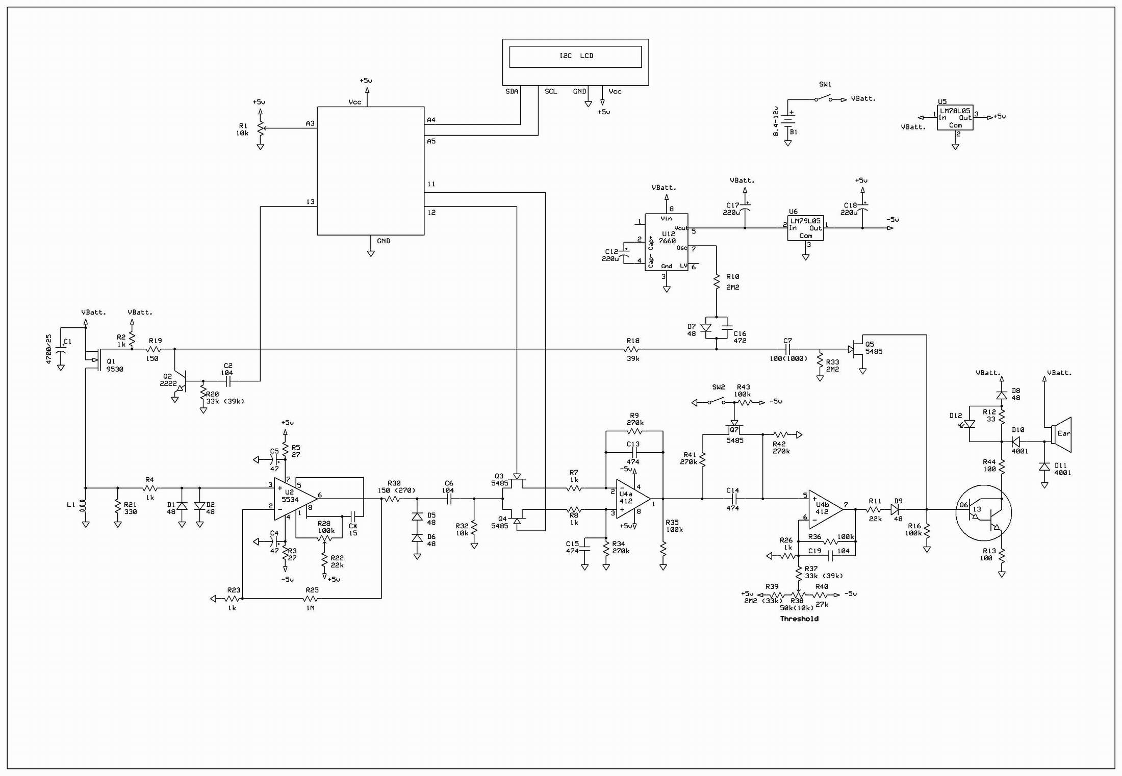 Some schematics use + and - 5 volts on the 40106 chip, others like the geotech bara rev A, use -5 volts and ground.