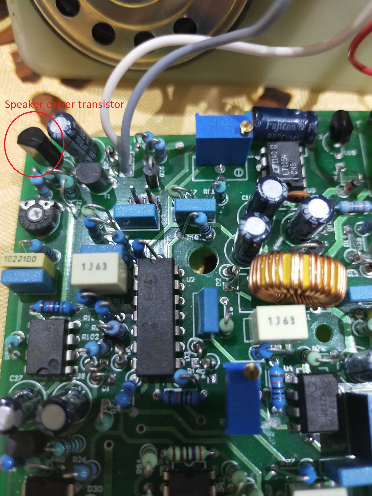 Before you place new transistor can you measure voltage betwen "+Vcc" and "-Bat" points, i marked them on photo