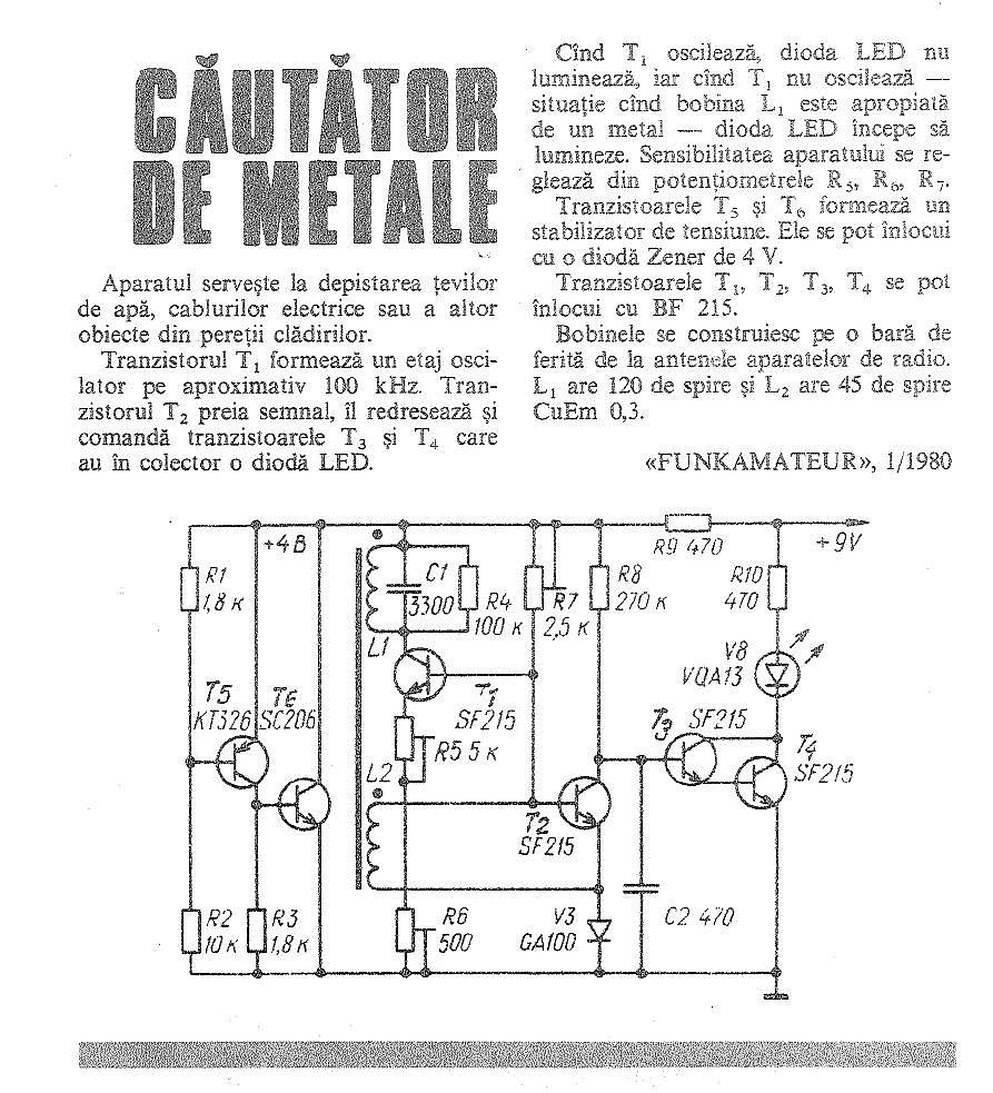 When T1 oscillates enuluminaza leds, and when not oscillating T1 - situation when the coil L1 is close to a metal - leds starts to shine. The sensitivity of the device is adjusted in potentiometrele R5, R6, R7