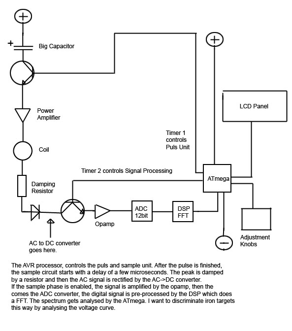 The voltage curve, which is induced by the metal object in the ground gets amplified by the opamp and then the signal will be converted by the ADC. After the ADC is the tricky point, shall I use a DSP for doing a FFT? Because I want to discriminate iron... In any case the ATmega will analyse the signal and show some information about the signal on a 2-line LCD. How fast has the ADC and DSP to be?