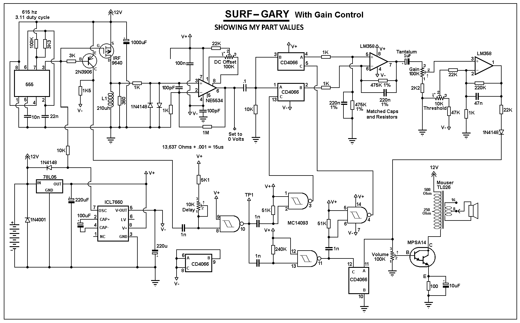 As to the Gain control I added, it is the same as shown in the Original Surf Pro Schematic by White's Electronics Inc. I also included the frequency control of the 7660 from the 555.