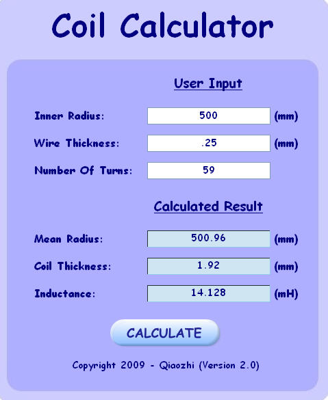 A 20" diameter coil is 508mm in metric. This means the coil radius is 254mm not 500mm, as you have entered in the dialog box.