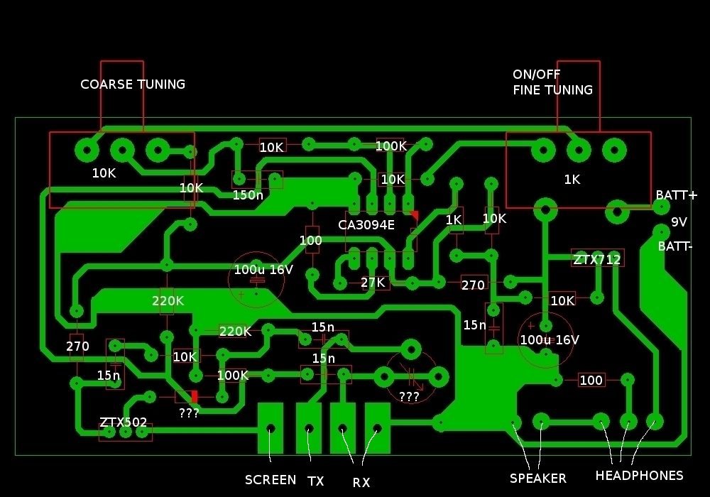 Here's the layout annotated with the component values, and the attached wiring. The TX coil connects between TX and SCREEN. The RX coil is center-tapped, with the tap connected to the screen. The diode looks like a general purpose signal diode, but it is not possible to see the actual value without removing it. The variable cap has no visible markings.