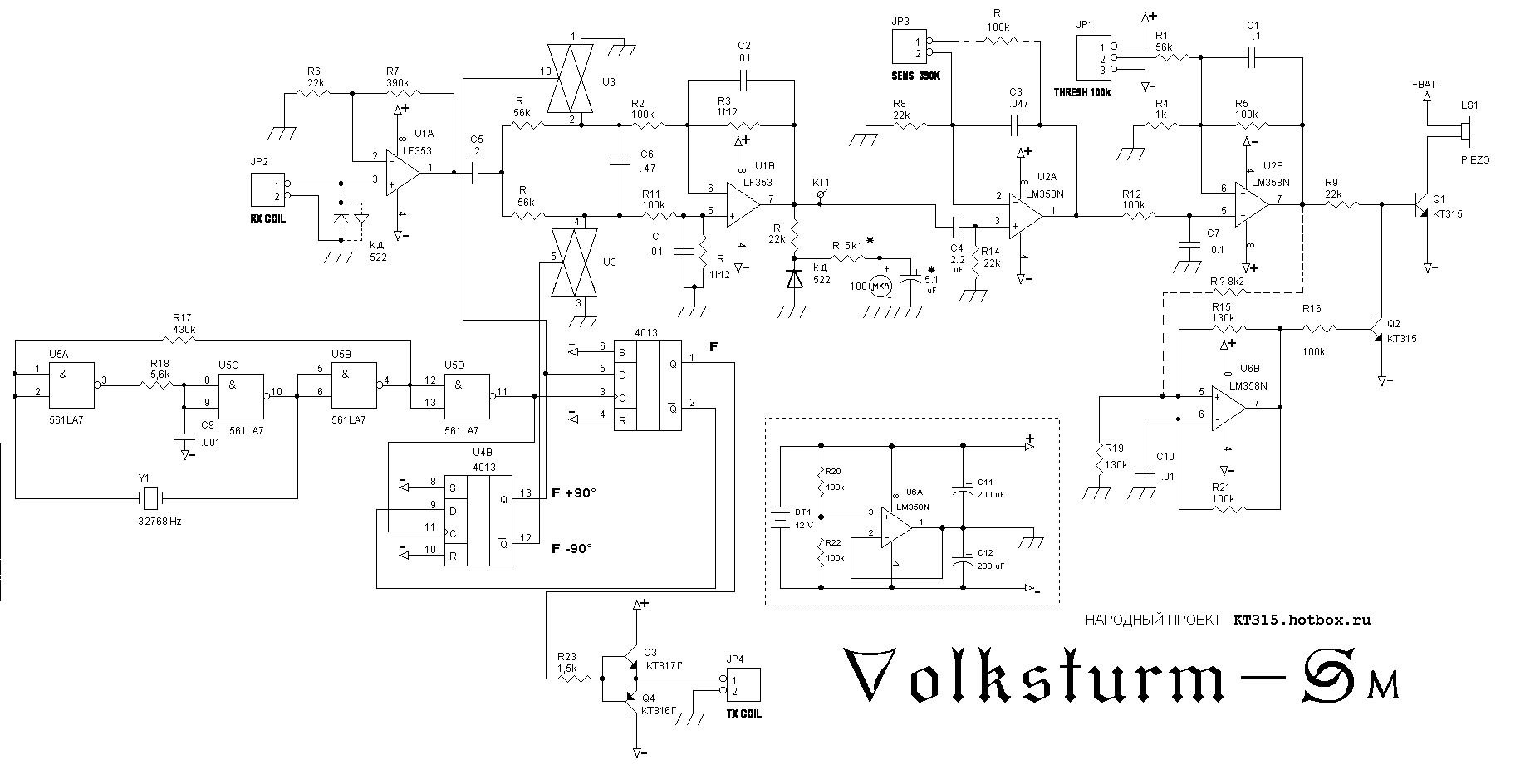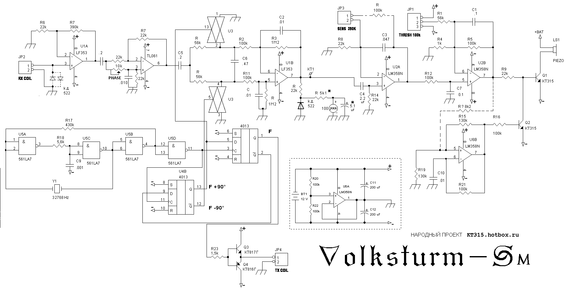 Thanks Gervm.Originally posted by Gervm View PostP1 really consist of 2 resistors connected sequentially - they tune phase. One does it roughly anoter does it smoothly or you can use one good many turns resistor as shown in circuit. R5 - 470kom. At the table it can "find" coin at 25-40 santimeters. It depends of diametre of coin and quality of unit and its head. Working requency is 8 kHz.