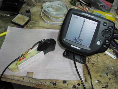 It uses 6 pcs lowrance 20 degree / 200 kHz transducers with paralell connection. As you can see there is some optimizing to do still...