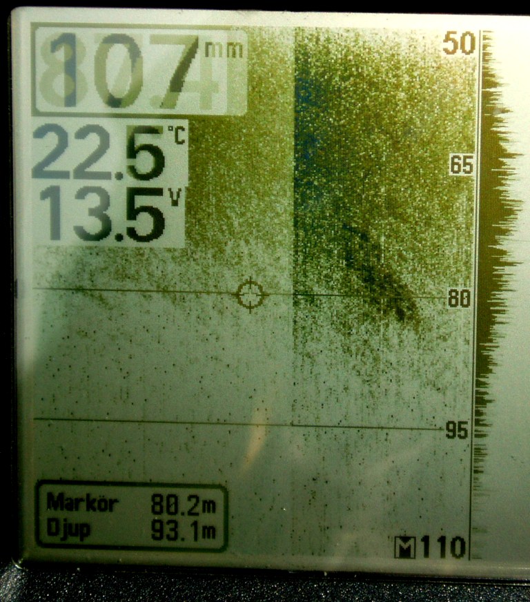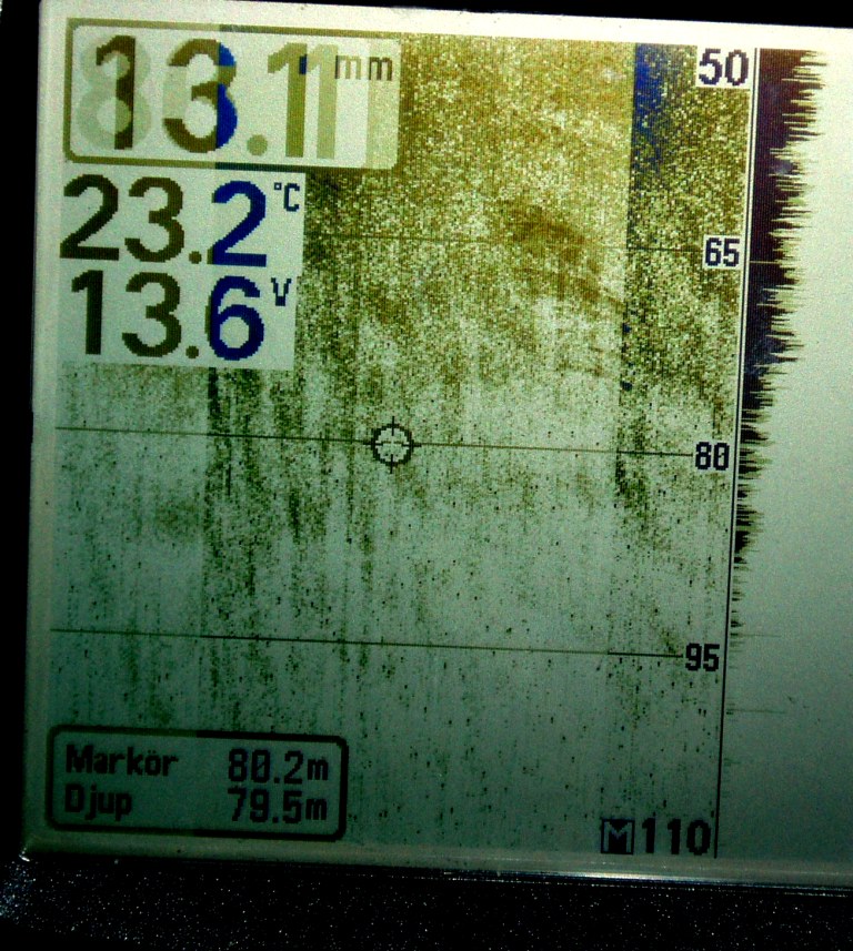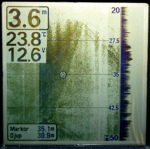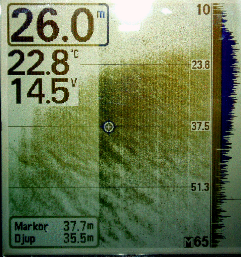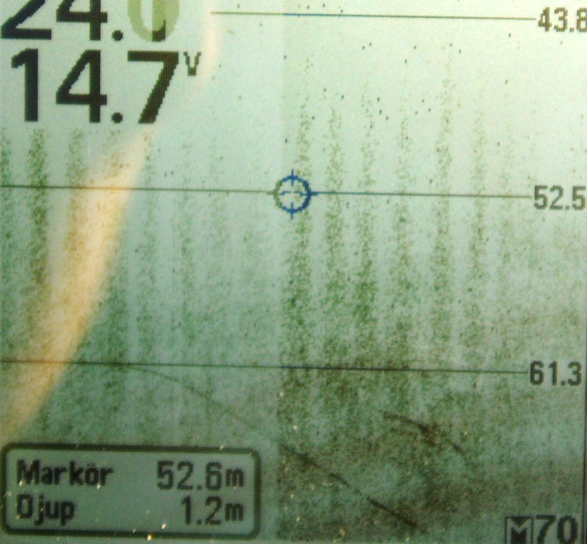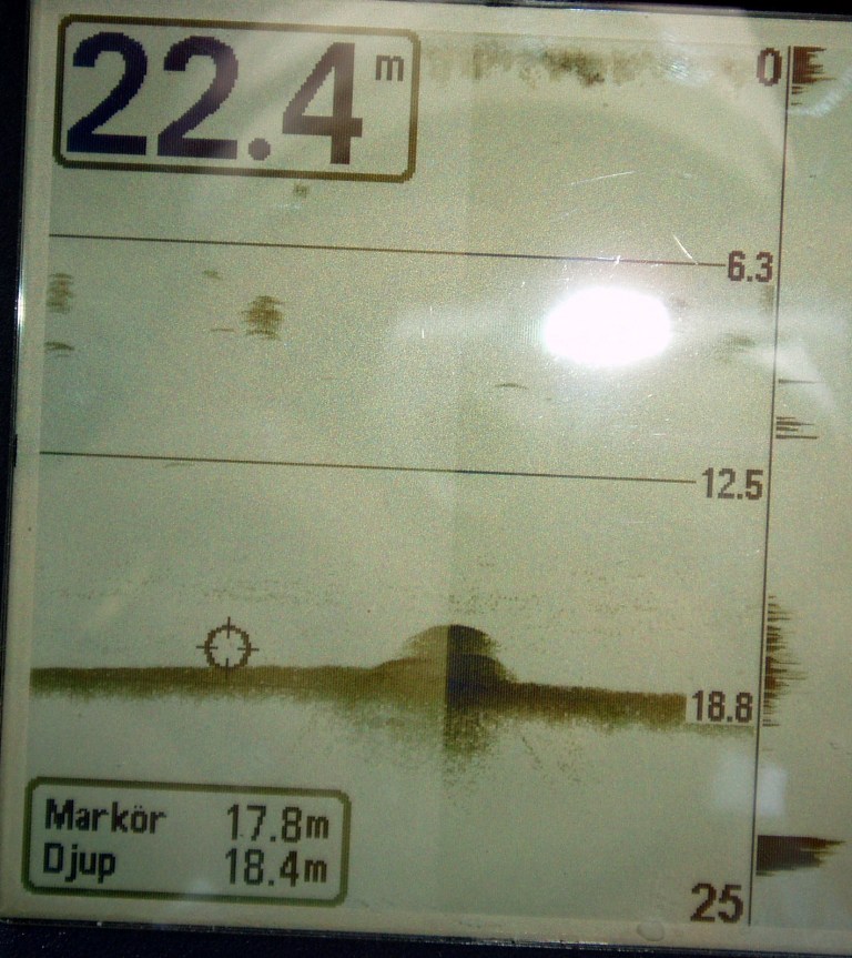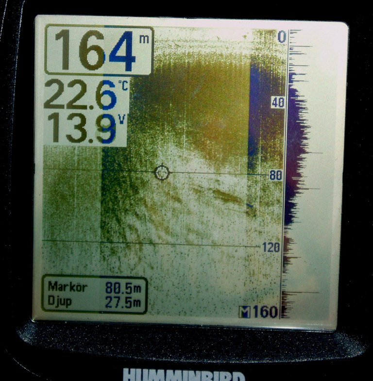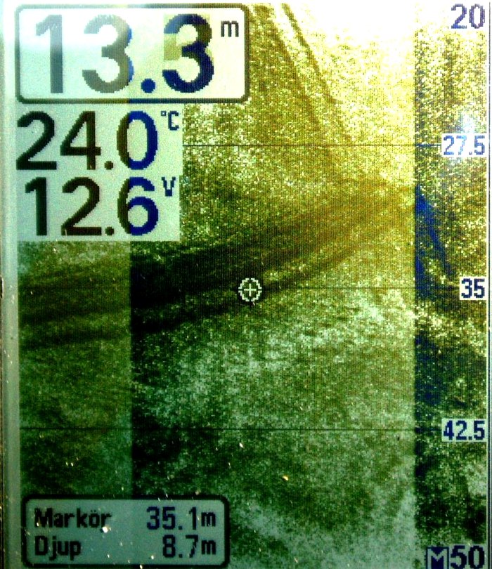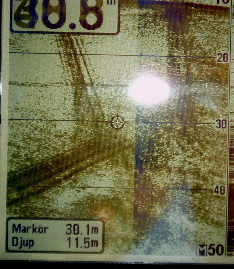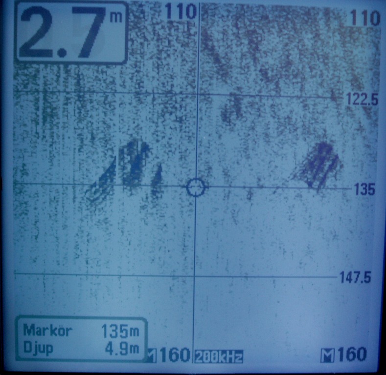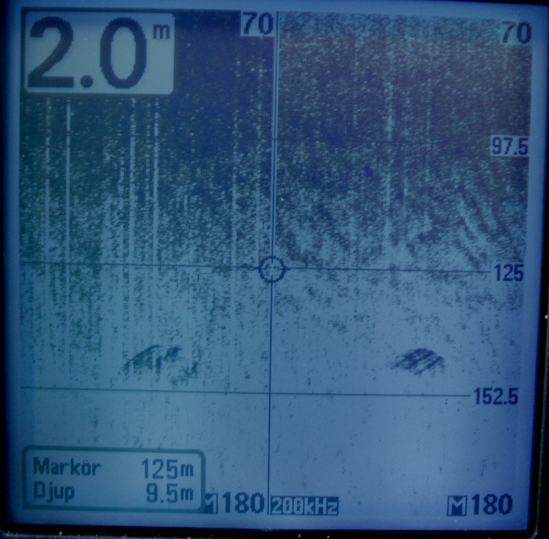 As the instrument can't store or export data I have to take photos of frozen screens. Tests are done in Sweden, on lake Mälaren, close to the city of Uppsala. The wreck photo shows a small boat, depth 9 meters. Note the wavy pattern caused by the rolling boat but note how little this effects the picture. The photo of wave formed gravel bottom is typical for the lake (a surprise for me). Depth 20 meters. The sunken concrete ponton rests at 8 meters just outside the marina.