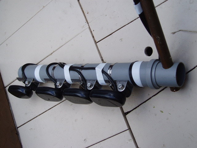 For some days I have tested a functional Dan Fountain style fishfinder sidescan sonar array and it is time to report. The array has four transducers. The transducers are unevenly spaced following an idea from René Pascal. Optimization of spacings are based on wave theory and implemented in Graphing Calculator for Windows. The heart of the system is a Humminbird Matrix 37. The transducers have four beams. 83 and 200 KHz, created with a dual frequency piezo, and two 455 KHz beams intended for "sidescanning" of fishes. The array is optimized for 83 and 200 KHz. The array is mounted on a metal pipe and the pipe is firmly attached to the boat side. The individual transducer cables are connected to a box on the boat. Thus the transducers are intact - no cutting of cables etc.