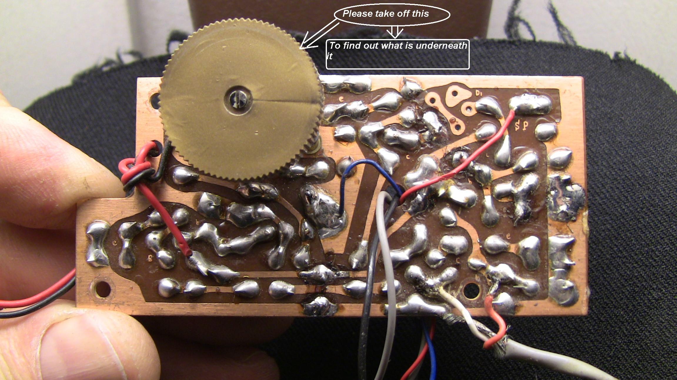 I wonder if now is the time to think about 'modernising' and improving the circuit. I think adding some high-frequency power rail decoupling would be worth doing, such as 47nF from 9V to 0V. The non-standard (today) 0.04nF ceramic caps could safely be replaced by 47nF ones in all locations, I think. C7 could be replaced by 47pF, assuming the '50' means the cap is 50pF. Quick calculations suggest that adding 50pF in parallel with 2000pF will cause an audio output shift of 17KHz, which seems a bit excessive. I wonder if C7 may be 5.0pF? This would then give 5KHz shift, which is more sensible. Maybe this detail is one to sort out later. Anyone think that R20 (pot) and C7 should swap positions? Then the pot wiper and one fixed end could be grounded, the other fixed end going to C7.