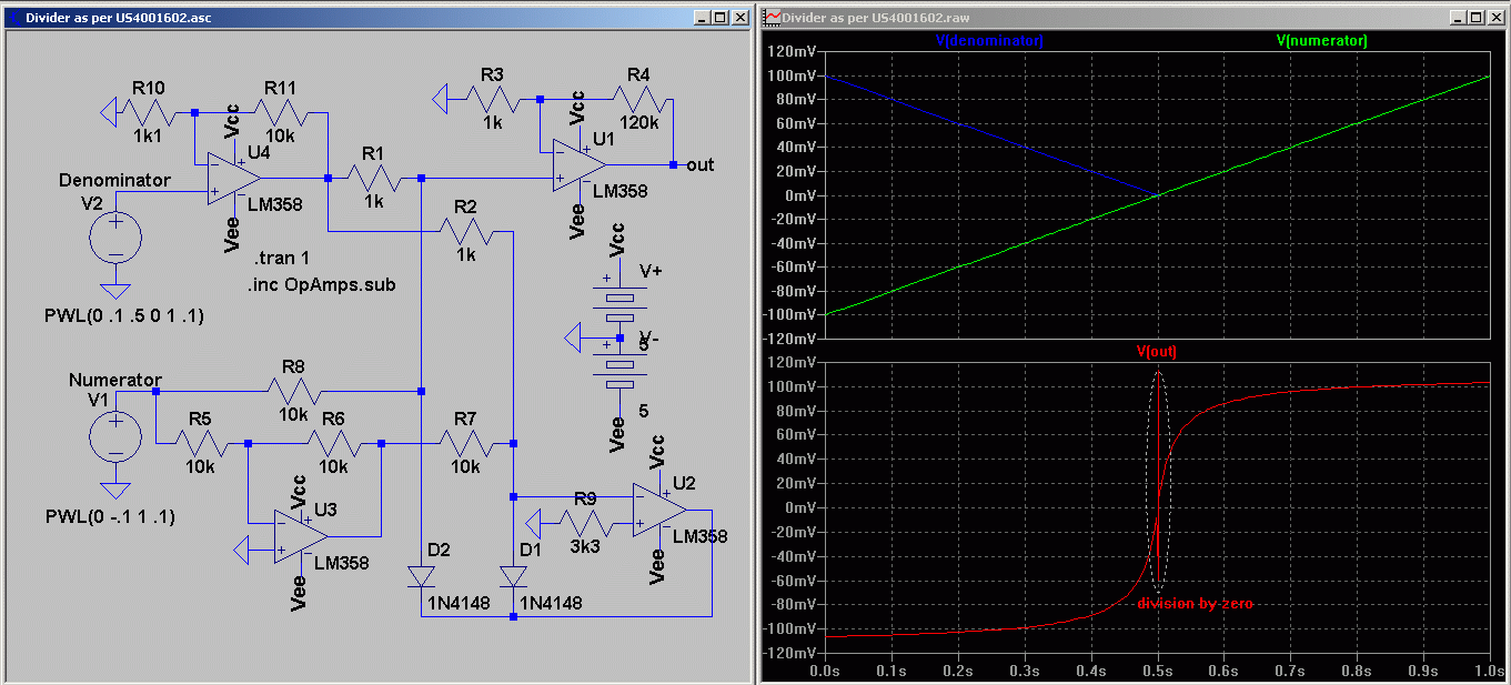 A basic series of devices built with garden variety parts continues. For a start, I have a little gem, built according to a long forgotten patent US4001602. It is a real 2 quadrant divider with very timid response at low denominator values. To exaggerate it's transfer function, I supplied both numerator and denominator inputs with ramp function, and only the denominator one is abs ramp (having V shape, all values positive). Referent voltage is 100mV, hence division with 100mV will give out the numerator voltage, same as being divided by 1.