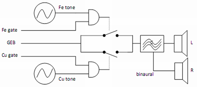 Sounds are produced by means of amplified and conditioned GEB channel. As it is aligned to have null at ground response, and freely adjustable to assume any angle of the foreseable ground responses, even the exotic ones, it will be very flexible. The angle is relative to the Tx angle, but not with the frequency, so only minute adjustment may be needed when Tx frequency is changed.