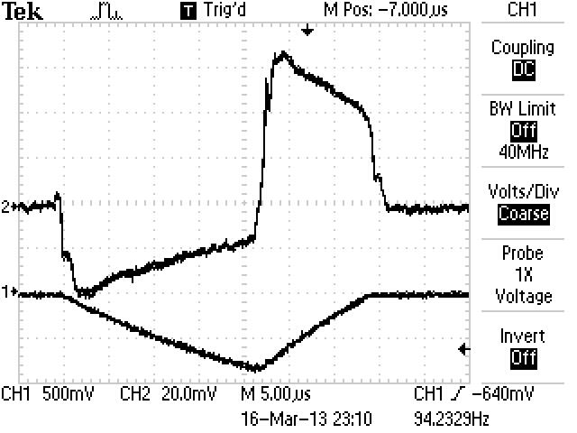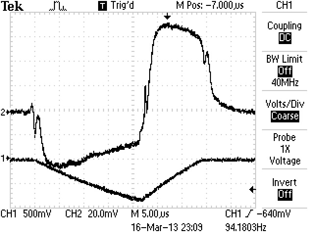 Using some components that I have to play with. 4093 drives a IRF740 . OP27 amplifier pins 2 and 3, 400 ohm connected to ground. Rx coil ground to pin 3. 4000 ohm resistor pin 2 to pin 6. 400 ohm resistor or a diode in series with a 5 volt zener across the coil. The first plots measured the coil volts. Forgot to change scope scale to 50 volts when changing the probe to x10 with the 400 ohm damping resistor. The latter plots measure the volts across a 1 ohm resistor in series with the coil (coil current). Signal measured at pin 6 of the OP27. You are saying no one measures the signal during charge or discharge of the coil ? The quarter and aluminum foil have lost almost if not all signal strength at 8-15 usec. I can't argue with success but I'm having a hard time seeing how you can detect a quarter unless my measurements aren't correct.