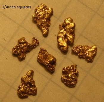 That are exactly what I would expect small nuggets look like. Compare with my picture in post 247. Some of mine (bottom right and some in the pot) are more rounded and dull due to abrasion in a stream bed. The three at the top are undetectable, except on a Fisher Goldbug 2, as they are just a bundle of filaments.