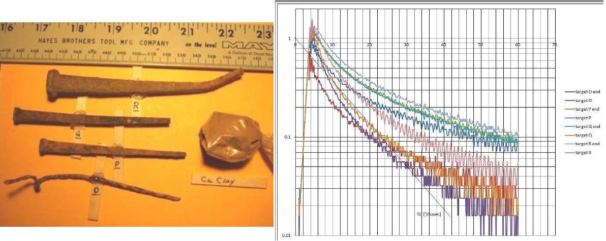More targets from Ca. I didn't expect the nails to plot a straight line on a log log graph. Since they did I thought maybe these targets would, except for V flat they didn't. The thin targets were rusted. Maybe someone could explain what target trait causes the slope to be straight on log log or linear log.(100 x 265 mm coil)
