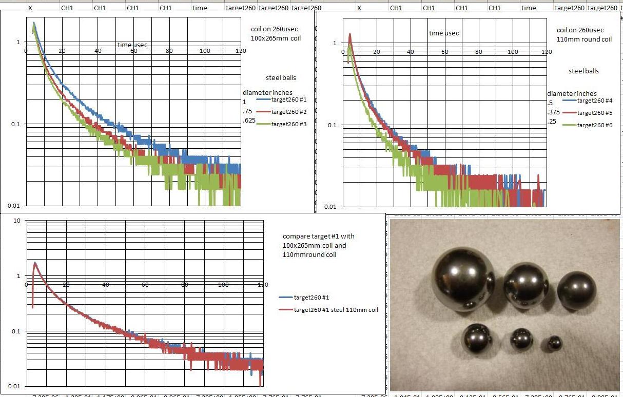 More targets. Switched to the 110mm round coil to get more signal for the smaller steel and aluminum balls. The comparison of the 1 inch steel ball with each coil shows no difference in the decay.