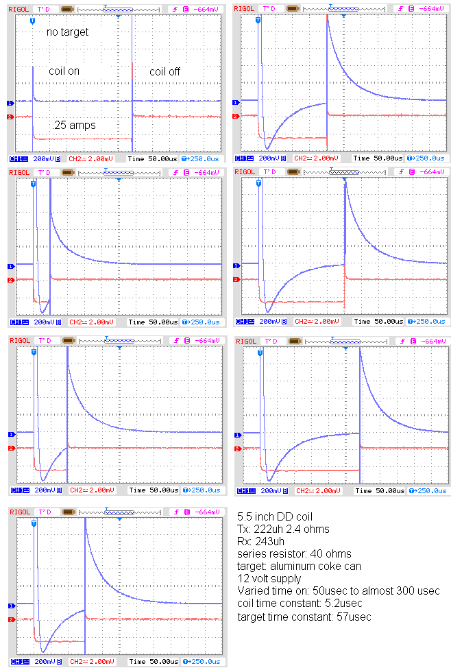 In my original calculation based on your scope traces I used 350 kHz not 377 kHz, and the calculated result was 324 ohms. The ratio between 625 and 350kHz =1.78. If I multiply the 324 damping resistance by the ratio it is 579 ohms. Calculating the 'coil only' resistance PI X .625 X 295 = 579 ohms. The difference is the effect of the capacitance added by your detector electronics. The 'coil only' or 'coil with feed line' self resonant frequency is a good indicator of coil speed but as Joe points out that speed is significantly diminished by the added capacitance of the detector electronics. Therefore the damping resistance must be determined with the coil in circuit.