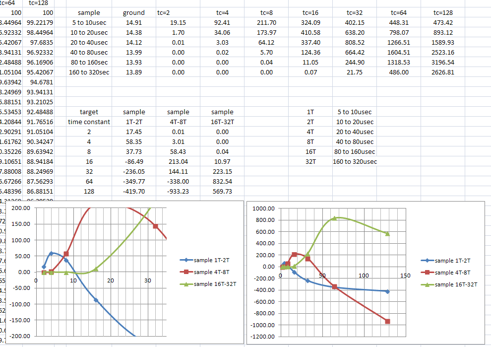 An attempt at charting it. Used same data that was used for #1 and reply#3. Forgot to label X axis (target time constants) y axis (amplitude)Originally posted by Davor View PostThe scheme I propose for Minipulse (and further) is a sequence: delay=1T, +sample=1T, -sample=2T, +sample=4T, -sample=8T, +sample=16T, -sample=32T, ... and appropriate EF at the end.