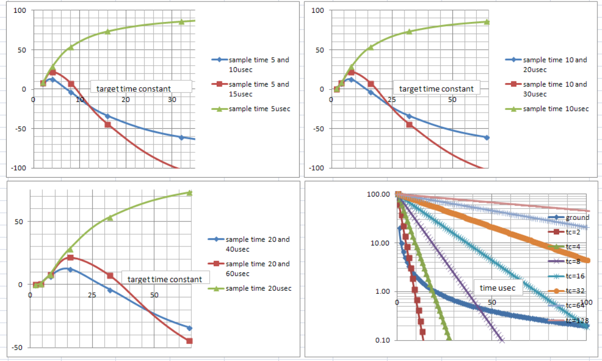 There has been some discussion of GEB in at least two threads lately. [TDI ground balancing scheme, twice over] and[ Replies to Minipulse Plus]. I charted some data to see if I could understand the problem. The lower right chart is a log-linear plot of ground (1/t) with an amplitude of 20 at 1usec and target time constants with an amplitude of 100 at zero time vs time in usec. The other charts plot signal amplitude vs target time constants sampling at different times. The lines with two samples reject ground, ((sample 1 amplitude - (sample 2 amplitude x sample 2 time/sample 1 time)). The single sample plots the percent amplitude based on 100 at zero time for the different time constant targets.