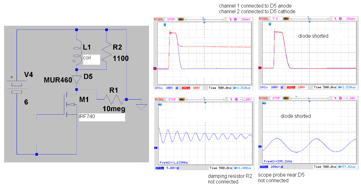 The scope probes are connected to the coil and IRF740 drain for the decay pictures, but not the resonance pictures. The decay curve with the diode shorted looks like it takes an extra 250 nsec to decay. With the change in R damping that's required to prevent oscillation the delay period before the first sample might have to increase by 3 times. With 100 volts/division it's hard to see when the coil has damped close to zero volts. It's more than the 1.5 usec from the trace.Originally posted by kt315 View Postyou forgot inner capacitance of a o-scope probe influence. connect it AT THE COIL DIRECTLY and you will get something another.