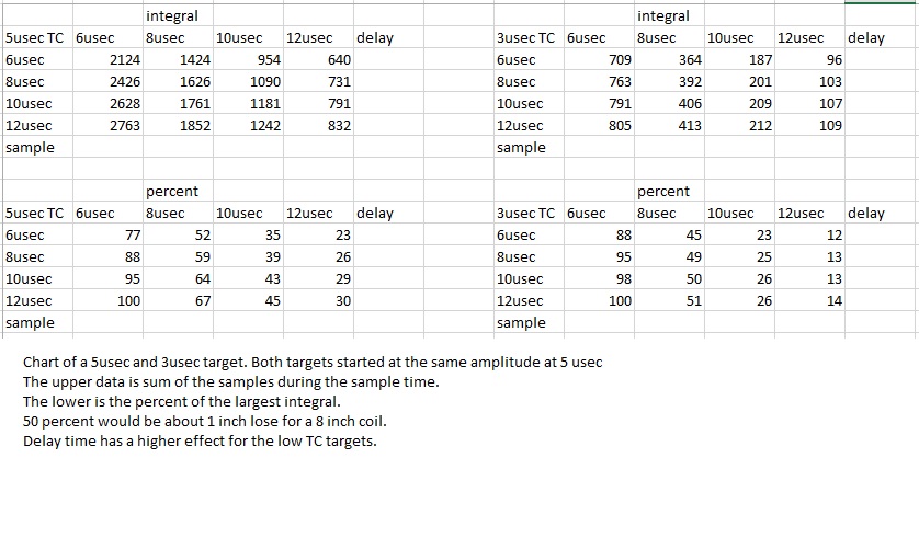 Charted some data using the simulator. Wanted to see the effect of varying delay and sample times for low TC targets (small nuggets). I adjusted GB delay time with a 100usec GB sample for GB. For the low TC targets GB didn't effect the data. Maybe ground does.Attached Files
