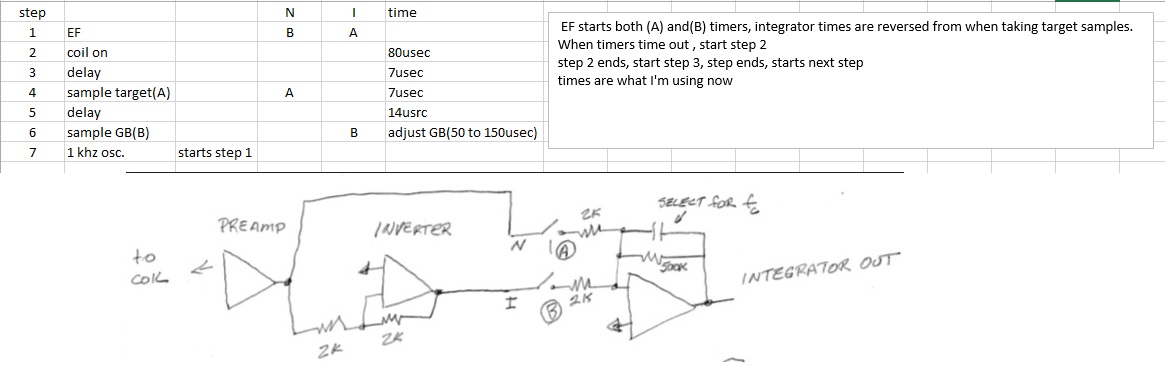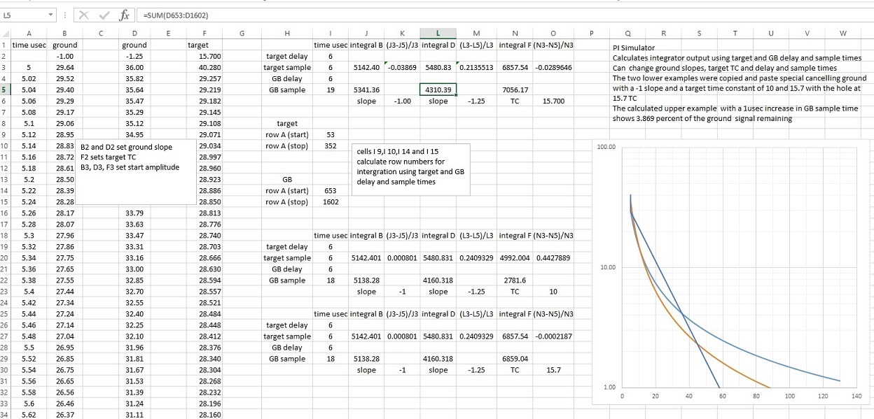 Thanks for the sites. I'm trying to simulate what happens with my hardware controller. I forgot about adding the target and ground effect for the EF sample to the simulator. Can effect the output. Integrate amplifier out normal and inverted. Normal during target and EF sample time and inverted during GB sample time. Need to make all the sample times adjustable for experimenting. EF time= GB time-target time. Whether it's done with excel or formulas doesn't matter. Maybe adding the EF sample to the simulator would be worth while. The controller shows fixed times for all but GB delay time, a guess at what I thought might work. All of the times are adjustable with my bench controller. Want to compare bench results using different coils and amplifiers with simulator. Mostly trying to learn something.Originally posted by WM6 View PostAttached Files
