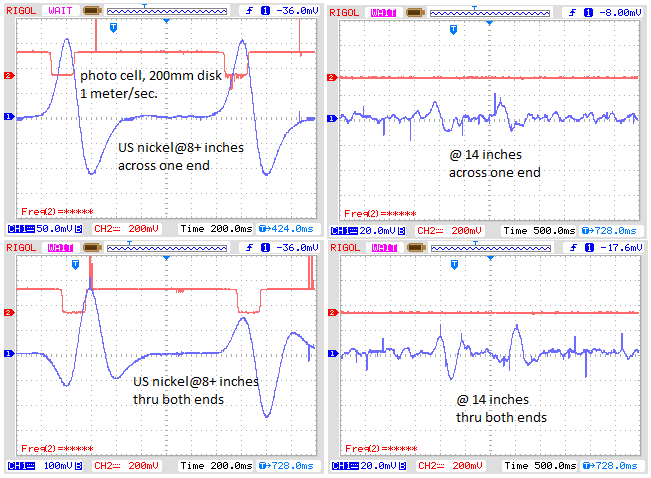 Lately I've been using an integrator and two post amp stages with a .01usec feed back TC each stage followed by a negative absolute value and a 2.3Hz 5pole butter worth filter. Recorded some scope pictures with the integrator and post amp feedback TC changed to .033usec without the abs. value and 5 pole filter. R7 and C4 are the feedback RC for the integrator, 10k input resistors in series with input switches(1C integrator). A photo cell was mounted 8 inches above the coil, a 200mm diameter disk was glued to the bottom of the water bottle swinging from a pendulum, US nickel stuck to the disk. 200mm/.2second=1meter/second. The nickel swings across one end or from end to end across both. Bottle was pulled back about 18 inches and let go then caught on the rebound, crosses coil twice, I think I like the circuit without the absolute value and 5 pole better.