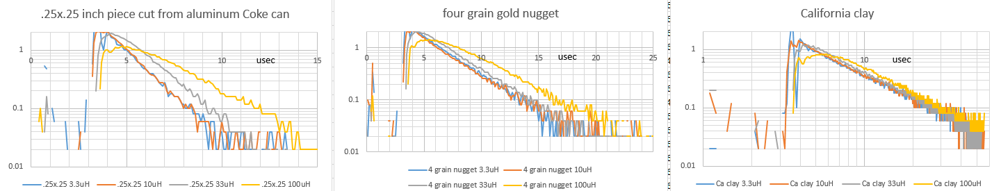 Some of the discussion was if felezjoo-PI could detect a .25x.25 inch piece cut from the side of an aluminum can. Charted the decay for the can, US nickel and some California clay. The slower amplifier changes the decay. Trying to understand what it all means.