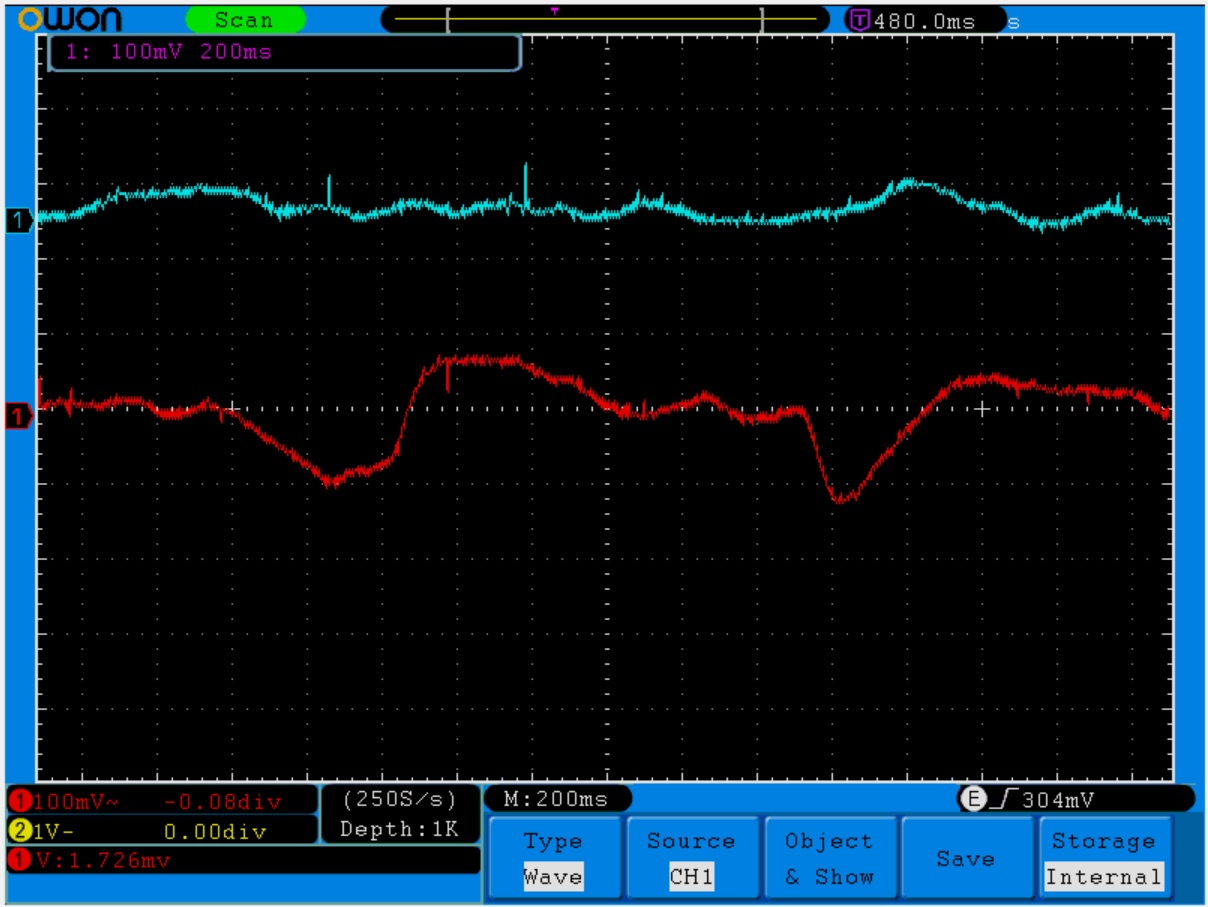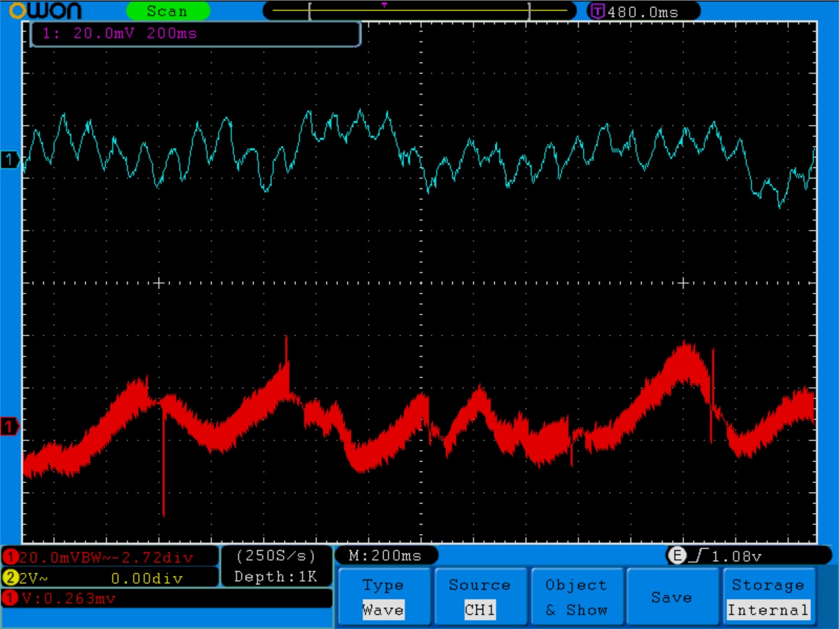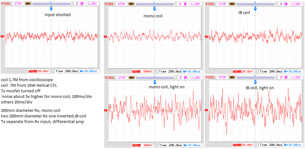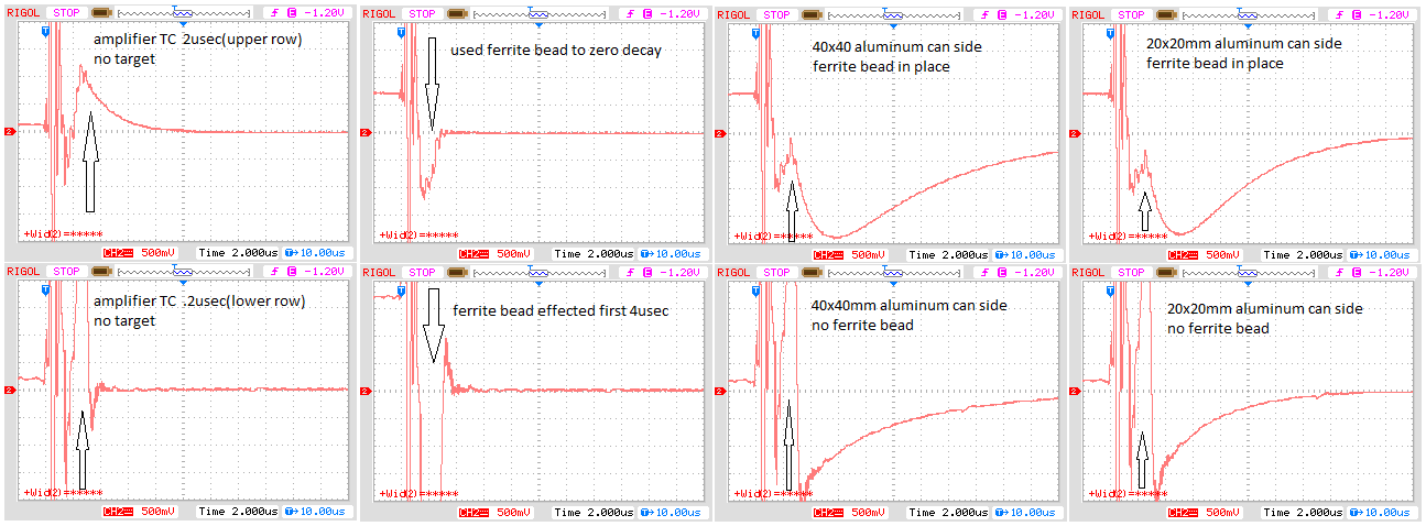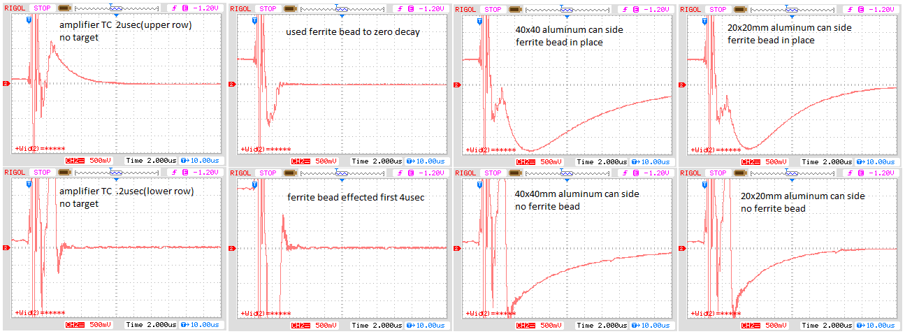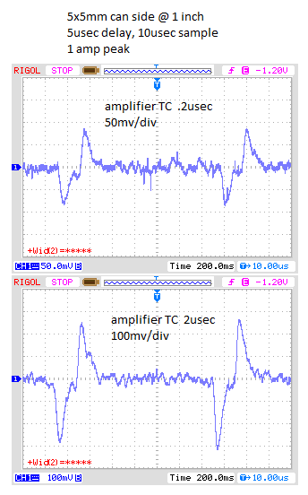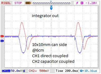 Looks like I've been taking stupid pills lately. I'm used to measuring time between peaks to get period but there are two zero crossings for every peak or valley crossing the reason I kept getting the wrong pendulum period. Some thoughts. Maybe adjust target distance for peak target signal equals 1.5 or 2 times peak noise signal. Maybe someone could scope the audio output of some commercial detectors to see if something similar could be used. Modified my pendulum setup. Used a plastic 12oz water bottle full of water instead of a glass bottle. Ran the pendulum line thru a hook in the ceiling to an anchor point to give easy height adjustment. Coil to hook height 219cm. Pendulum height changes but I couldn't think of an easy way to move the coil to adjust target height. Including a scope picture to show signal waveforms. The direct coupled integrator out is capacitor coupled to the next gain stage. Once I get the noise better and we agree on the pendulum setup I'll try to adjust target height for the 1.5 or 2 times signal to noise level for the 5x5, 10x10, 20x20 and 40x40mm can side targets.