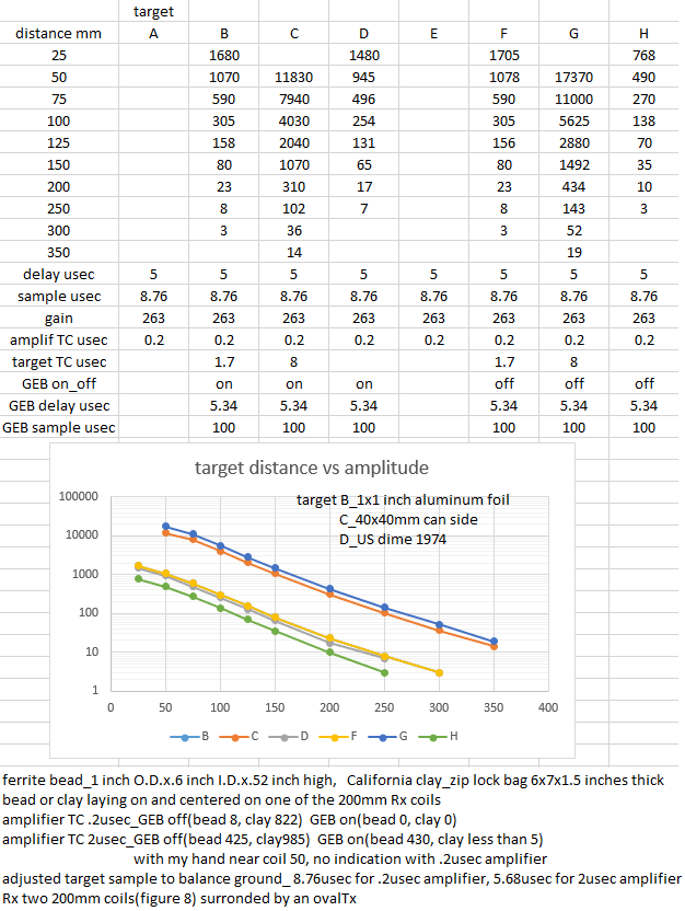 Haven't been able to reduce the noise yet. Tried to chart amplitude vs distance for some targets with the .2 and 2usec amplifier. The 2usec amplifier looked better with the swinging target. Wasn't as stable looking at integrator out with a voltmeter and had other problems. One being a change in output when I placed my hand near coil which I didn't see with the .2usec amplifier. B and F, C and G, D and H are the same targets.