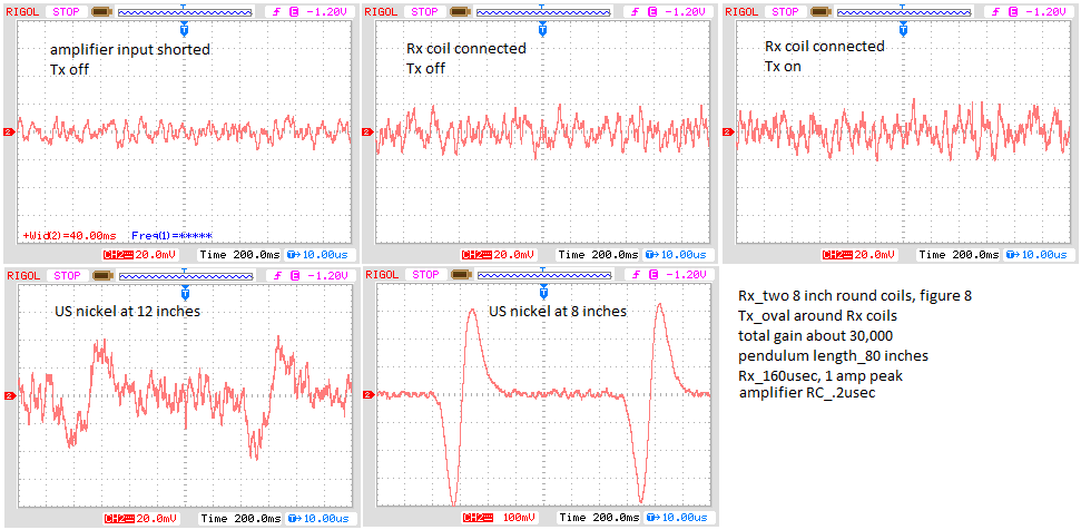 You are doing great.Originally posted by green View PostGood thought, I'll include a photocell on my next order. Been trying to increase signal to noise. Using a difference amplifier with separate Rx and Tx is working best for me. Including some scope shots. I read detecting a US nickel at distances far greater than 12 inches. I could try a larger coil and or higher peak current to increase the signal. Does someone have some scope pictures to compare or tell me how low I should be able to reduce the noise?