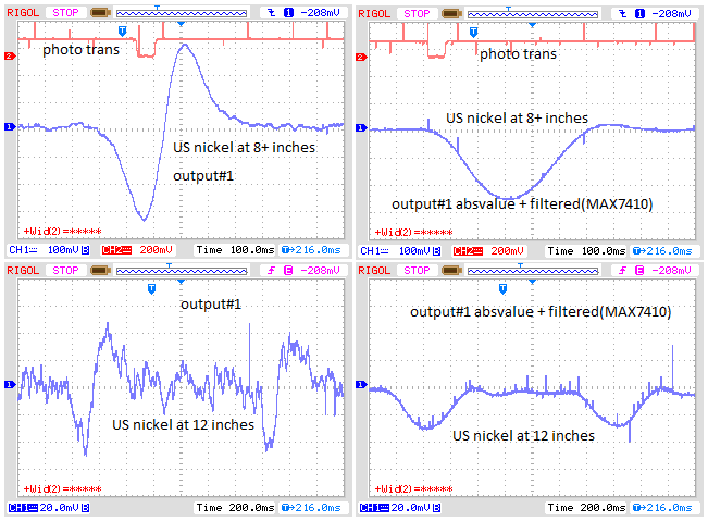Good thought, I'll include a photocell on my next order. Been trying to increase signal to noise. Using a difference amplifier with separate Rx and Tx is working best for me. Including some scope shots. I read detecting a US nickel at distances far greater than 12 inches. I could try a larger coil and or higher peak current to increase the signal. Does someone have some scope pictures to compare or tell me how low I should be able to reduce the noise?Originally posted by Old cart View PostOne other addition that might be very useful would be to add a photocell pointing toward the ceiling. If this is hooked to the second channel of the scope it could sense when the target blocks the light as it would when the target is directly over the coil, this would allow you see coil response delay relative to target position.Attached Files