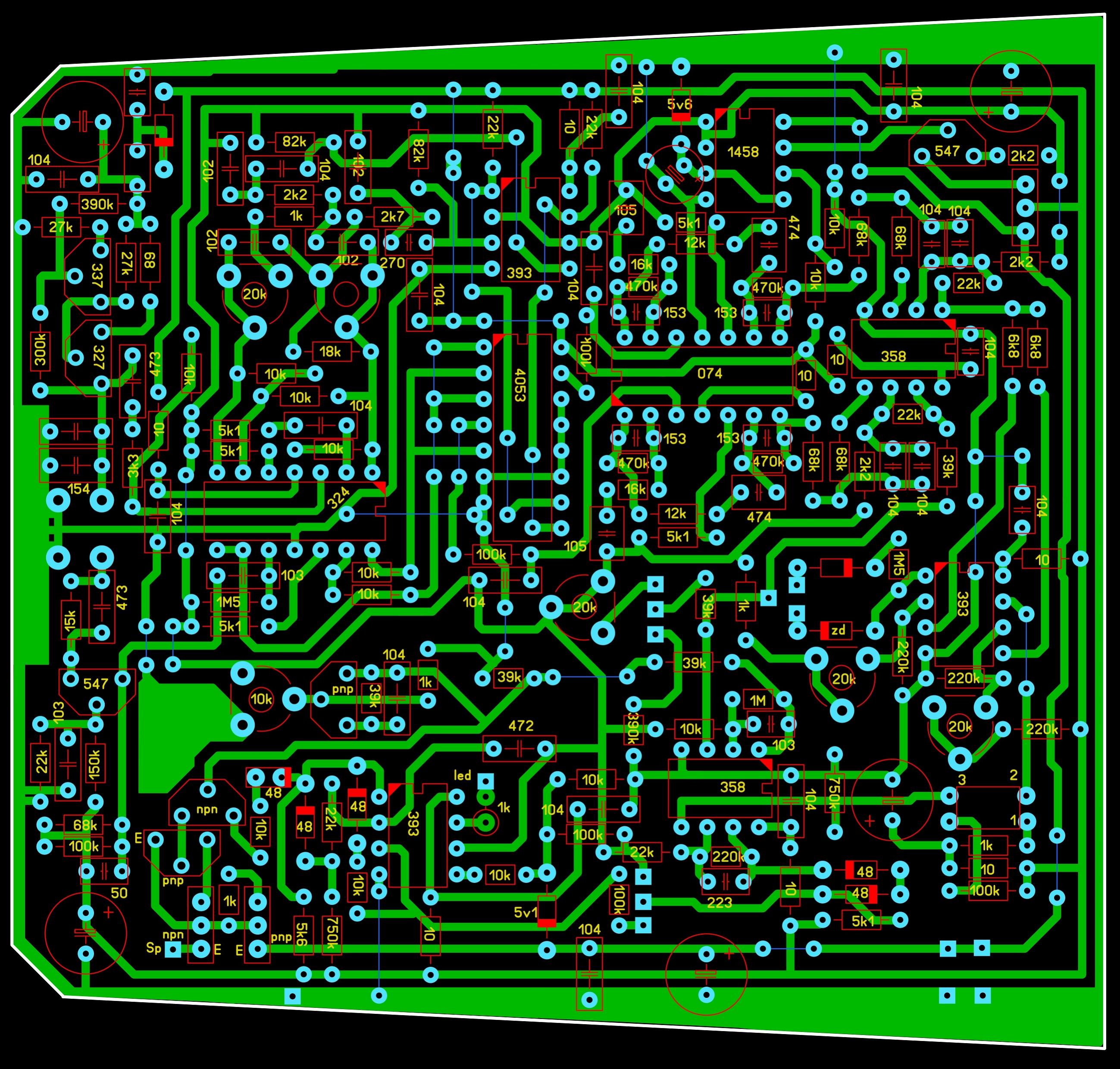 I looked boards of ivkonic and I can say that he has turned layers of the PCB. Green layer, shown as C2, really should be a layer C1 /standing on top of the board and/ vice versa C1 blue layer should be a layer C2 /standing bottom the board/.