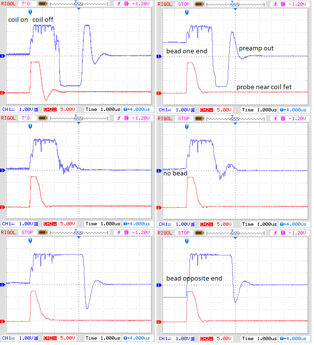 Some scope pictures. First column, adjusted damping resistor, top picture under damped, bottom picture over damped. Second column, placed a ferrite bead on coil with best damping. Used an IB coil, Rx(two 8in. round figure eight) Tx(oval surrounding Rx)constant rate 6250 amps/sec. Scope external triggers when coil driver commands off((T), top screen second division from left). Bead causes a signal change when coil is on. Bead causes a signal change out to 5usec after current is turned off even though the coil volts looks flat 1.5usec after turnoff. Probe was placed near fet because connecting it to the coil caused a change in preamp out. Should target delay time be set past where a ferrite bead causes minimal change or doesn't it matter?
