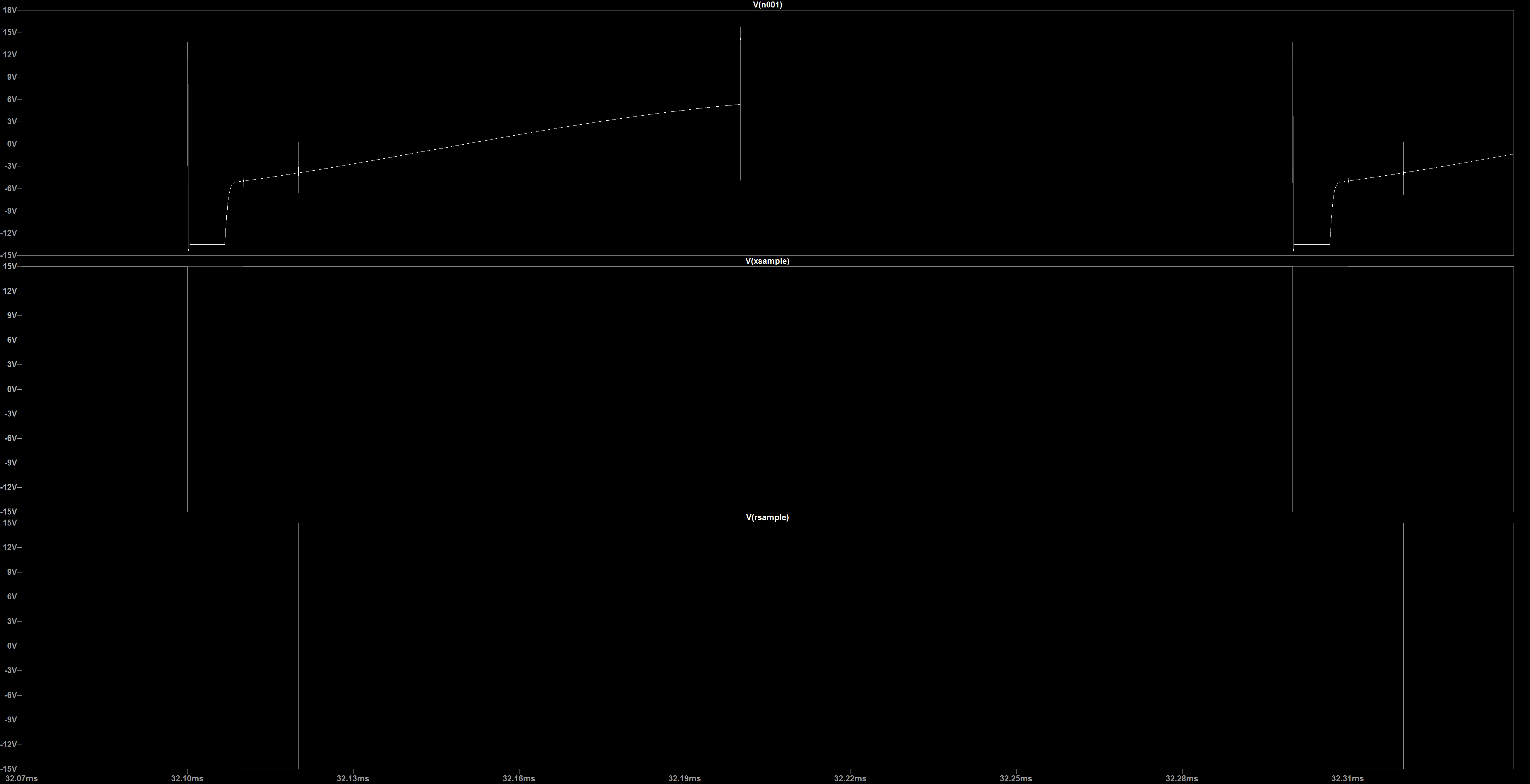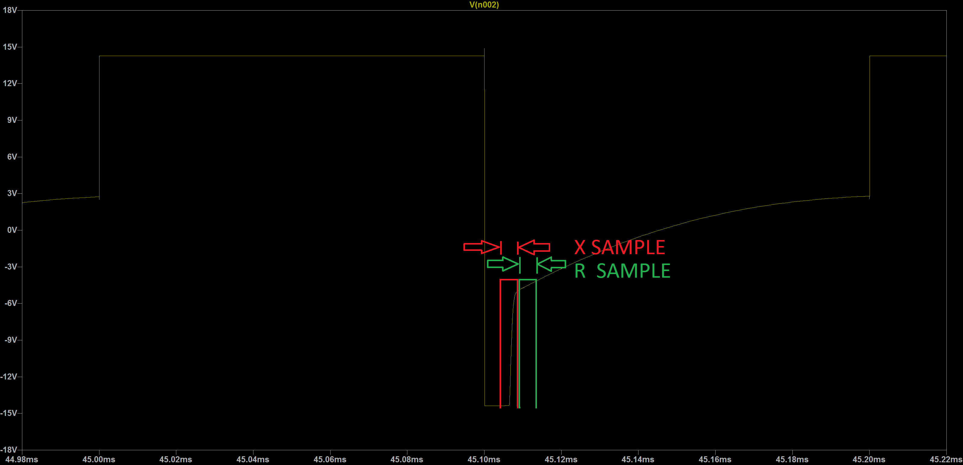 Note that the first sample ... samples the "edge" or X SAMPLE of the flyback and the second sample samples the amplitude R SAMPLE .... the samples must be accurate and adjusted in duration and start stop times to balance the diff integrator summation.