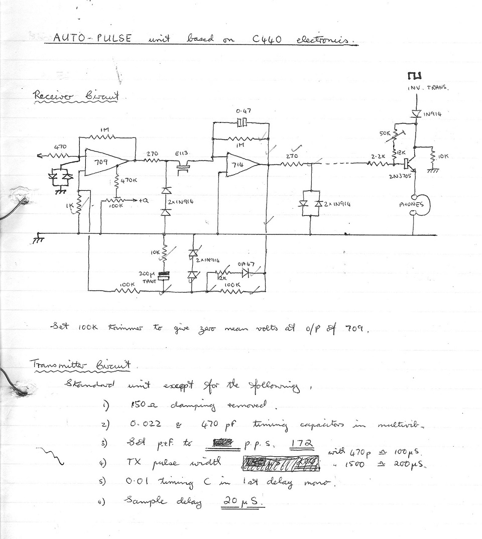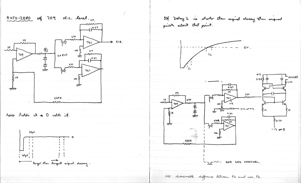 The recent post by Eclipse enquiring about the 'Compensating Pulse', prompted me to look through my old notebooks from 1970's. In 1976 there was a couple of pages describing an auto-zero circuit that I tried, and which had some interesting properties. As you can see on the second page it causes the output of the first amplifier to pivot around the point where the sample is taken when a metal target is introduced. The 709 generates a negative waveform that decays upward to zero for short/medium decays, while long decays cross over to give an additional positive response when beyond the mid point of S2.