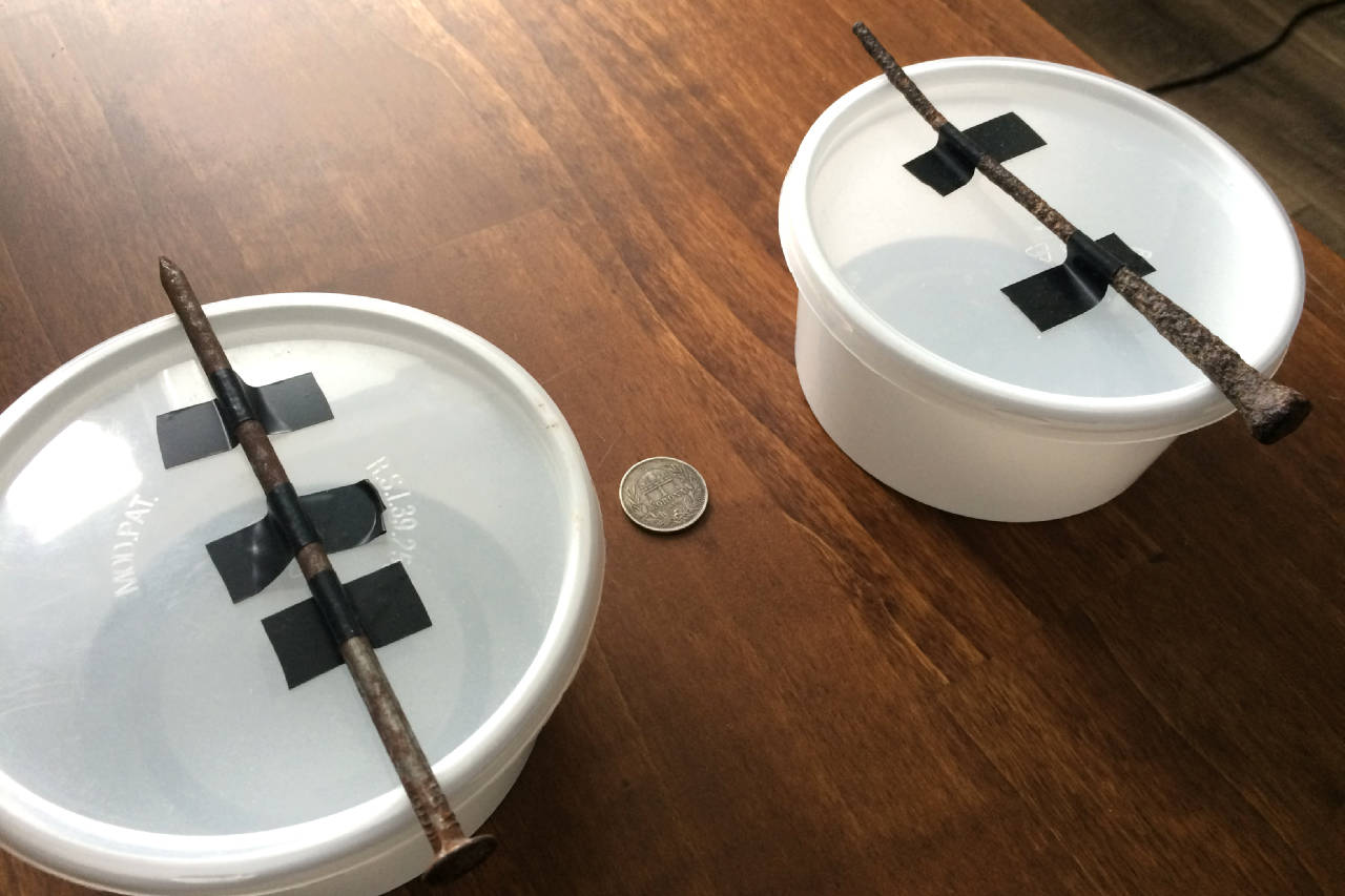 There are 4 nails to just be rejected. Then a coin (US Indian Head or modern Zinc cent) is placed in