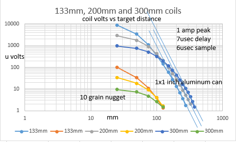 I'm not for using a lot of current but I see it different. Chart from reply #7. Target size shifts the amplitude vs distance curves for the different size coils vertically. If a target was just detectable at 25mm with the 300mm coil increasing the current 25% should double the detection distance. The percent improvement is highly dependent on target size and the initial detection distance. For detection distance greater than the coil diameter the improvement is small. For an increase in coil current the percent increase in detection distance for a target cut from an aluminum can side 5x5mm should be a lot higher than a 25x25mm target.